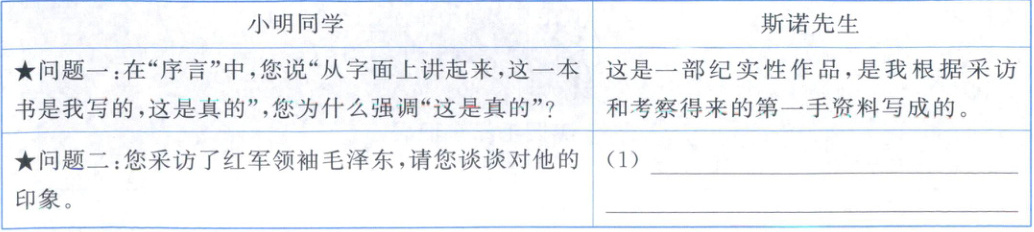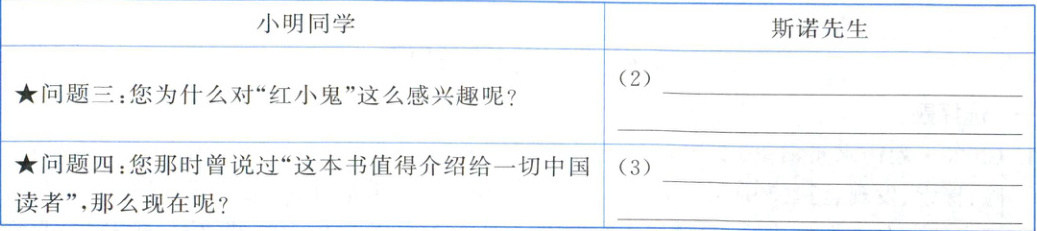 4. (亮点原创)跨越时空,与斯诺相遇。小明同学读完《红星照耀中国》后,有一些问题想向斯诺先生请教。请你根据这本书的内容,推测斯诺先生会怎样作答。