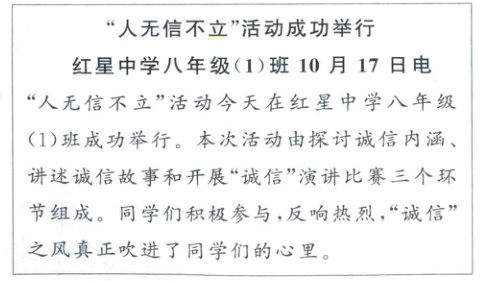 (3)新趋势实践探究请以“人无信不立”活动为背景,挖掘新闻素材,写一则消息。要求:①条理清楚,表达准确,符合文体要求,题目自拟;②120字左右。