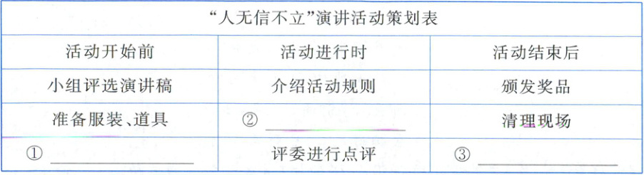 (1)【活动策划】小育同学负责策划班级演讲活动,请你帮助他补全活动策划表。