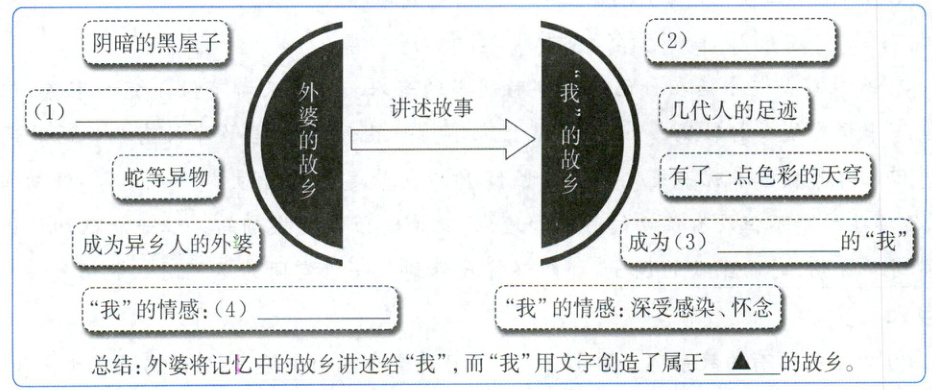 6. ①故乡在江南小镇的外婆有着“浓重的外乡口音”,对于“我”来说是一个异乡人。②外婆离开故乡多年,对故乡仅存回忆与想象,外婆对于她的故乡来说同样是一个异乡人。③外婆迷醉于叙述与想象的精神世界,对于注重现实生活的人来说,她是个异乡人。