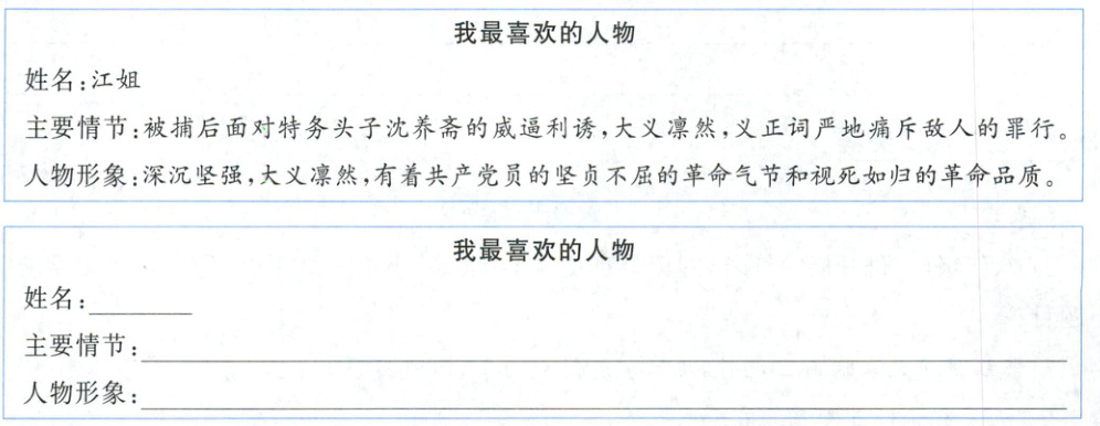 10. 【推荐名著人物】下面是小语为《红岩》中他最喜欢的人物制作的人物卡片,请你仿照示例也制作一张。