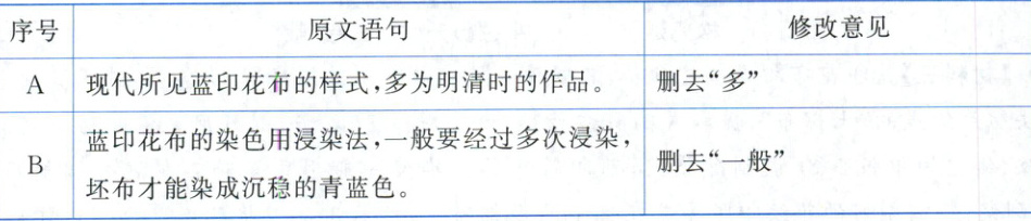 【材料三】蓝印花布印染工艺独特,其制作一般有以下几道工序。① 备料:选用民间手工方法纺线织成的“土棉布”,提取或购买靛蓝、靛青染料。② 刻版:刻好用来漏印防染浆的有花纹、镂空的印版。③ 调制防染浆:蓝印花布的防染浆一般用豆粉和石灰混合调制而成。④ 刮浆:将刻制好的花纹印版覆盖在铺平的白棉布上,然后用刮刀将防染浆糊刮到印版上,这样防染浆就通过印版镂空的部分刮到坯布上,形成花型。⑤ 晾干:将刮印好花型的坯布在通风的阴凉处晾干,以备染色。⑥ 染色:将坯布投入料池浸泡染色。[B]蓝印花布的染色用浸染法,一般要经过多次浸染,坯布才能染成沉稳的青蓝色。⑦ 刮白:将浸染好的布料晾晒千后,用刮刀刮去防染浆。再经过漂洗、晾晒,一块蓝底白花的蓝印花布就完成了。