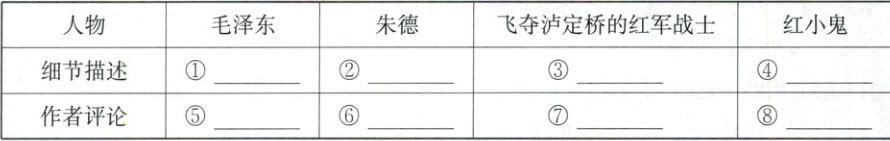 答案:5.(1)①F ②C ③G ④H ⑤E ⑥A ⑦B ⑧D (2)彭德怀 ①②④ 【解析】 (2)第一空,根据读书卡内容“在体育上他是很活泼的,很好的骑手,他很能吃苦,这一半因为他是一个不吸烟者和节欲者”可知,这位革命家是彭德怀。第二空,联系名著内容可知,①②④是彭德怀的经历,③是贺龙的经历。