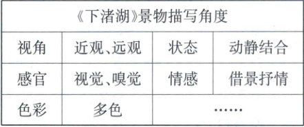 4. 有同学列出了《下渚湖》景物描写角度表,请你选择一个角度对本诗进行赏析。