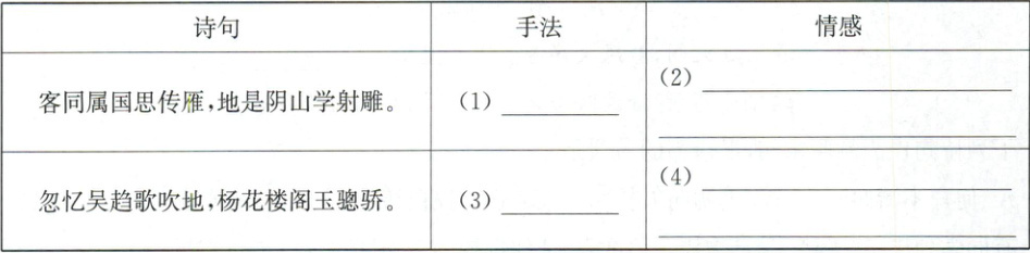 6 (1)用典 (2)运用苏武出使匈奴被囚的典故,表达了诗人对有朝一日能被赦免返乡的渴望之情,也透露出诗人无罪被遣的无奈苦涩;从“学射雕”一事可以看出诗人入乡随俗,正视现实,身处困境依然乐观向上的积极心态。 (3)想象与联想 (4)回忆江南繁华热闹的景象,表达了对家乡的思念之情。
