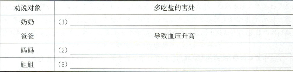 答案:1 (1)引起骨质疏松 (2)导致咽炎发作 (3)不利于皮肤保水 2 D 【解析】 根据材料一“储盐大户知多少”中的“有些果蔬汁生产商为了增加风味,会在果蔬汁加工过程中加盐,1瓶可能就含有162毫克钠”可知,有些果蔬汁是“储盐大户”的原因是其生产商在加工过程中加盐,而小红的姐姐是自己榨果汁喝。 3 ① 建议买竹盐,因为竹盐的宜食人群包括炎症、胃肠道疾病、慢性肾病患者及“三高”人群,适合小红患有咽炎的妈妈和轻微高血压的爸爸。②建议买玫瑰盐,它能够帮助控制血压、平缓情绪和强健骨骼,适合小红年事已高的奶奶和轻微高血压的爸爸。