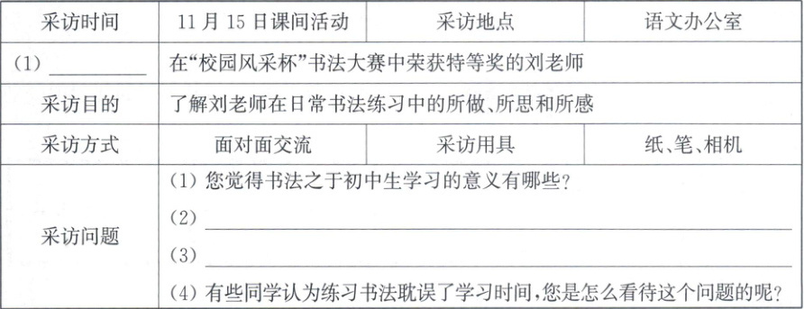 5. 班级举行以小组为单位的新闻采访活动,报道的题材为有意义、有价值、彰显正能量的校园热点话题,请结合材料二中的人物通讯报道内容,补全采访提纲。
