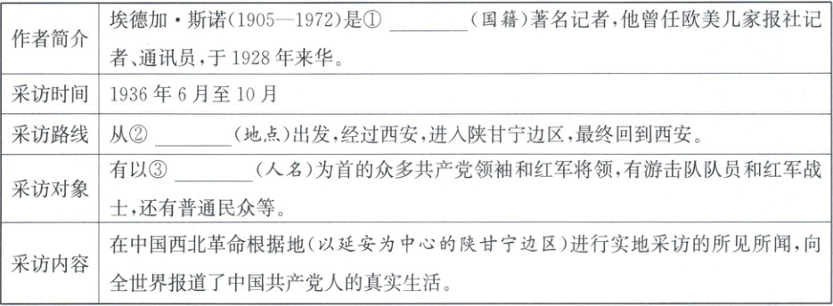 答案:6.(1)①美国 ②北京 ③毛泽东 (2)B 【解析】 (2)这一事迹的主人公是徐海东,不是“红小鬼”。