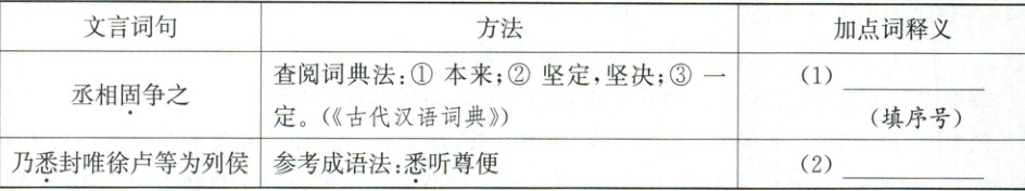 答案:12. 五岁/迁为丞相/景帝甚重之 13.(1)② (2)全,都 14.(1)不是刘氏家族的人不能封王,没有立功的人不能封侯。(2)那么凭什么去责备不守节操的臣子呢? 15. ①景帝废栗太子时,周亚夫极力争辩,坚决规劝他。②景帝想要给皇后的哥哥封侯,周亚夫劝阻了他。③景帝要封唯徐卢等人为侯,周亚夫直言劝阻。 【参考译文】 周亚夫回朝后,朝廷重新设置了太尉官。五年后,周亚夫升任丞相,景帝非常器重他。景帝要废栗太子时,丞相周亚夫极力争辩,也未能劝阻。景帝从此就疏远了他。而且,梁孝王每次进京朝见,常常跟太后讲周亚夫的坏话。 窦太后说:“皇后的哥哥王信可以封侯了。” 景帝说:“请让我和丞相商议这件事。”景帝就与丞相周亚夫商议这件事,周亚夫说:“当初高皇帝规定‘不是刘氏家族的人不能封王,没有立功的人不能封侯。谁不遵守这个规定,天下人共同攻击他’。如今王信虽然是皇后的哥哥,但没有立功,封他为侯是不符合规定的。”景帝听了默默无言,只好作罢。 后来匈奴王唯徐卢等五人投降汉朝,景帝想要封他们为侯以鼓励后来的人投降汉朝。丞相周亚夫说:“那些人背叛自己的君主投降陛下,陛下如果封他们为侯,那么凭什么去责备不守节操的臣子呢?”景帝说:“丞相的意见不能采用。”于是把唯徐卢等人全都封为列侯。周亚夫于是称病引退居家。景帝中元三年,周亚夫因病被免去丞相职务。