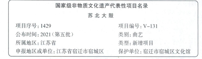 目前,宿城区83岁的刘汉飞被确定为苏北大鼓省级传承人。当今社会,人们对文化生活的需求越来越多元化,而苏北大鼓这一传统曲艺却面临听众减少、演员老化、后继无人的困境。亟待政府采取必要的措施给予保护,以使该项目得以传承和发展。
