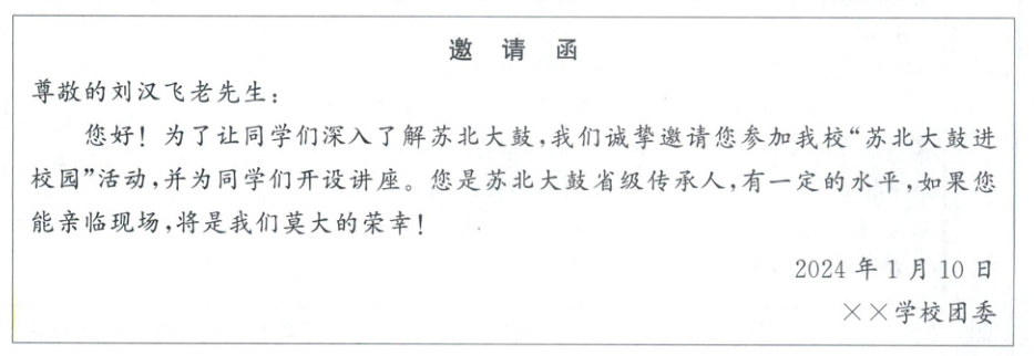 。”(3)为了让同学们更加深入了解苏北大鼓,校团委决定邀请苏北大鼓省级传承人刘汉飞参加“苏北大鼓进校园”活动。下面的邀请函中内容和格式均有不妥之处,请写出修改建议。