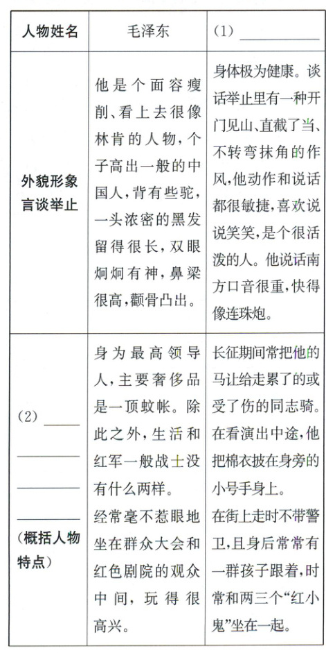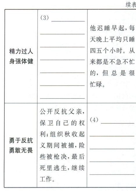 答案:2.(1)彭德怀 (2)爱护部下、同甘共苦、平易近人 (3)每天工作十三四个小时,常常到深夜二三点钟才休息。强健的身体要归因于少年时代在田里干过苦活、读书期间的艰苦锻炼。 (4)在被捕期间,尽管受尽各种刑罚,他也没有招供屈服。