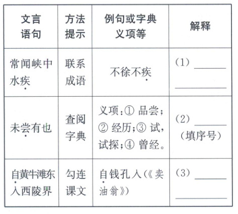 答案:8. 仰瞩俯映/弥习弥佳/流连信宿/不觉忘返 9. (1) 快 (2) ④ (3) 从 10. (1) 陡峭的山崖有的高约千丈,壁上的石头颜色缤纷,形状常常类似各种东西。 (2) 那重叠的山崖和秀丽的山峰,奇特的构造、怪异的形状,实在很难用言辞来叙述。 11. 山脉高峻重叠,绝壁千丈,山石形态奇异,树木高大茂密,山谷中猿鸣声清厉凄婉。