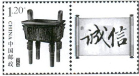 该邮票以左侧的鼎和右侧的写有诚信二字的卷轴为主要构图要素。最左侧写有邮票面值1.20元、CHINA、中国邮政字样和一个印章。
