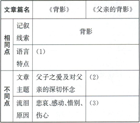 10. (链接课文)本文与朱自清的《背影》均抓住“父亲的背影”来展开叙事抒情,但在文章主题等方面有所不同。请联系朱自清的《背影》,品读两篇文章,填写表格。