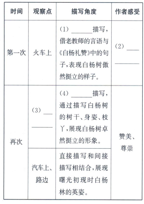 答案:8 (1)间接 (2)激动、震撼 (3)近距离(或:白杨树下、白杨林中) (4)直接 9 运用了拟人、比喻的修辞手法,展现了白杨树英姿飒爽、坚强不屈、挺拔伟岸的特点,表达了作者对白杨树的赞美。 10 示例:抓住“没有”这个词来表现“抑”的一面,朗读节奏慢,语气轻。而读“但是”“更”时要体现由抑转扬的语气,“伟丈夫”要重读,既要读出句式的强烈语气,引起人们的深思,又要读出文章的激情与豪气。 11 ① 作为情感线索,贯串全文;② 引发联想,将眼前之景与茅盾先生《白杨礼赞》一文融合在一起,表达了作者的真切体悟;③ 进一步表达了作者对白杨的形象和精神的赞美之情 12 示例:白杨树身躯挺拔、树枝靠拢、外表朴质、个性坚强,是西北高原的代表性物种,是时代精神和民族性格的象征。茅盾先生敏锐地发现了这一审美特征,进而写下《白杨礼赞》这篇托物言志的散文。这首赞歌在抗日战争年代给全国人民传达了一种积极、乐观、明朗的信号,使之获得极大鼓舞。三者紧密联系,正如本文作者所说:一种树成就了一篇文章,一篇文章又反映了一个时代。