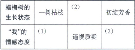 答案:3(1)哂笑轻视 (2)始终缄默 (3)惊喜赞赏 4将开在其他三个季节的花与春、夏、秋三季不开花的蜡梅进行对比,既反衬出蜡梅低调从容、沉得住气的形象,又反映了“我”急切盼望蜡梅开花的心情。 5用通感的修辞,将多感官互通,花香也有了重量,更表现了作者对梅花香的喜爱之情。 6①不抱怨苦难,坚定信念,努力生长,发挥自己的价值。就如梅花在成长过程中遭遇过漠视,遭到过嘲笑,遭受过排挤,依旧静静地生长,笃定地伸展枝干。②做人要低调从容、沉得住气,不要哗众取宠。就像梅花顶风冒雪,在最后一展芳华的那一刻是静穆的、从容的。