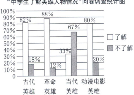 7 示例一:中学生对古代英雄、革命英雄、动漫电影英雄的了解程度高于当代英雄。 示例二:中学生对当代英雄了解较少。