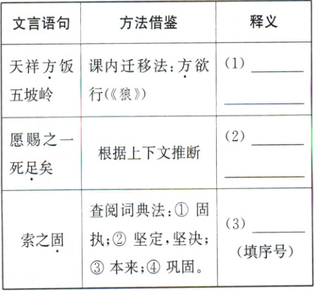 答案:9. 弘范/遂以客礼/见之 10. (1) 正 (2) 足够 (3) ② 11. (1)(文天祥)就写下所作的《过零丁洋》一诗给他。 (2)(文天祥)对吏卒说:“我的事结束了。” 12. ①“见弘范,左右命之拜,不拜”,文天祥做了俘虏,拒绝向敌人下拜,体现了“威武不能屈”。 ②“使为书招张世杰。天祥曰:‘吾不能捍父母,乃教人叛父母,可乎?’索之固,乃书所《过零丁洋》诗与之”,敌人要文天祥写书信招降张世杰,文天祥严词拒绝,体现了“威武不能屈”。 ③“上知天祥终不屈也”“安事二姓?愿赐之一死足矣”,文天祥被俘后,宁死不屈,体现了“威武不能屈”。