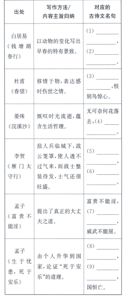 答案:7.(1)几处早莺争暖树 (2)谁家新燕啄春泥 (3)感时花溅泪 (4)似曾相识燕归来 (5)黑云压城城欲摧 (6)甲光向日金鳞开 (7)贫贱不能移 (8)入则无法家拂士 (9)出则无敌国外患者