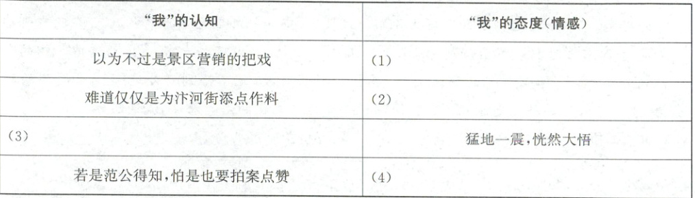 16. [理文脉] 梳理“我”对老程打更的认知及相应的态度变化过程,完成表格。(4分)