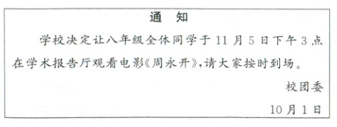 (2)学校决定让八年级全体同学于11月5日下午3点在学术报告厅观看电影《周永开》。请你以校团委的名义于10月1日在学校通知栏写一则观影通知。(3分)