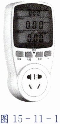 2. 小明的爸爸买回一种新型插座,如图 15 - 11 - 1 所示,它能即时显示接在该插座上的用电器的工作电压和所耗电费等(插座本身消耗的电能由内部的电池提供)。小明将装有质量为 2 kg、初温为 20 $°C$水的电水壶插在该插座上,这时插座屏幕上显示的数据如表 1 所示,当水烧开至 100 $°C$ 时,屏幕上显示的数据如表 2 所示。[已知电费单价为 0.50 元/(kW·h),$c_{水}=4.2×10^{3} J/(kg·°C)$]