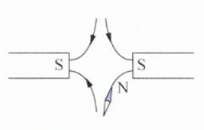 磁感线方向:所有磁感线箭头指向两个S极;小磁针斜向上的一端标注为N极。