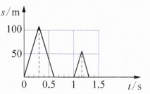 第一次信号:从$t=0$到$t=0.3\ \mathrm{s}$,信号位移从0增加到$102\ \mathrm{m}$(对应图(c)中100m刻度附近);从$t=0.3\ \mathrm{s}$到$t=0.6\ \mathrm{s}$,信号位移从$102\ \mathrm{m}$减少到0。