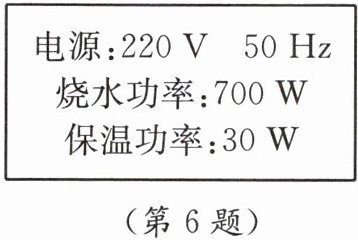 由铭牌信息可知,保温功率为30W。根据P=UI,保温时电流I=P/U=30W/220V≈0.14A。烧水功率700W=0.7kW,时间6min=0.1h,消耗电能W=Pt=0.7kW×0.1h=0.07kW·h。