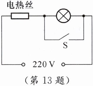 *13. 如图所示,一根电热丝与一个灯泡连接在照明电路中,灯泡上标有“220 V 25 W”字样,电热丝的规格为“220 V 100 W”。设灯泡的电阻不变,试求: