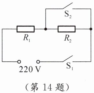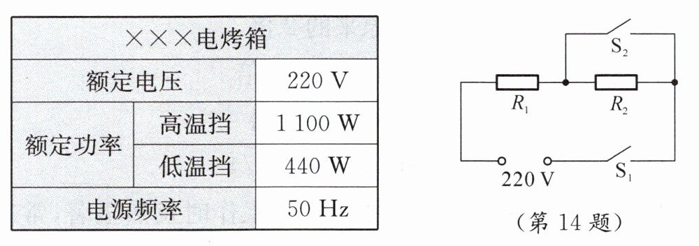 14. 下表是一台电烤箱的铭牌,其内部简化电路如图所示,$R_1$ 和 $R_2$ 均为电热丝。求: