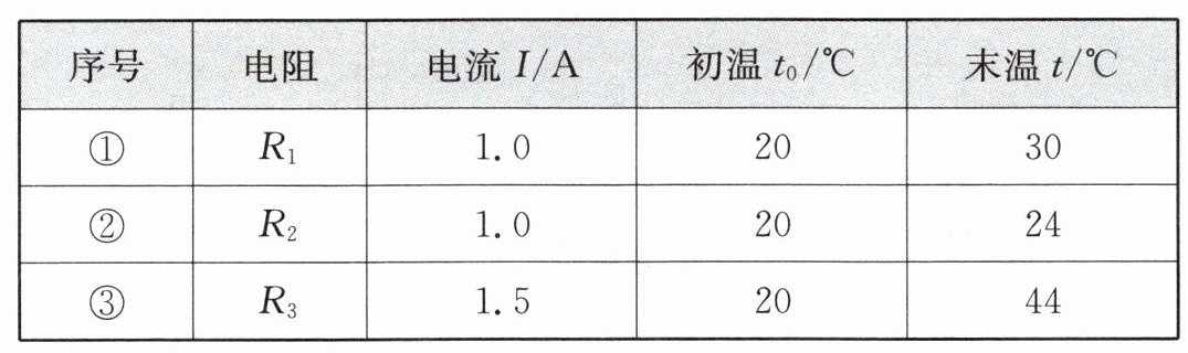 。答案:$R_1$、$R_2$ 所在锥形瓶中的煤油升温所吸收的热量之比为 $ \frac{t_1 - t_0}{t_2 - t_0} = \frac{30 - 20}{24 - 20} = \frac{10}{4} = \frac{5}{2} = 5:2$,但相同电加热条件下,加热相同时间,吸收热量之比等于温升之比,即 $ \frac{Q_1}{Q_2} = \frac{5}{2} $。