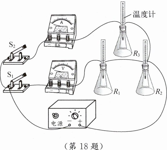18. 用如图所示的装置探究影响电流热效应的因素,三个相同的锥形瓶内均装有质量相等的煤油,电阻丝 $R_1$、$R_2$、$R_3$ 浸没在煤油中,其中 $R_1 = R_3 = 6\ \Omega$、$R_2 = 3\ \Omega$。记录煤油的初温 $t_0$。接通电源,同时闭合开关 $S_1$、$S_2$,记录电流 $I$、通电相同时间、煤油的末温 $t$,结果如下表所示,则 $R_1$、$R_2$ 所在锥形瓶中的煤油升温所吸收的热量之比为