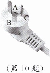 10. 如图所示为某家用电器的三线插头。细心的小华发现其露出的三个插片中$A$的长度最长,它是与用电器的