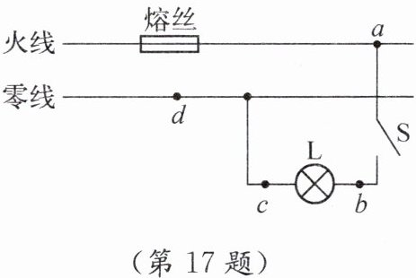 17. 如图所示的家庭电路中,当开关$S$闭合时,正常发光的灯泡$L$突然熄灭。电工用测电笔分别检测$a$、$b$、$c$、$d$四点,发现测电笔与$a$、$b$两点接触时氖管都发光,与$c$、$d$两点接触时氖管都不发光。若电路只有一处故障,则可能是(
