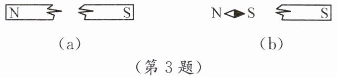 3. 如图(a)所示,一个条形磁体摔成两段,取右边的一段靠近小磁针,小磁针静止时的指向如图(b)所示,则右边一段裂纹处的磁极是