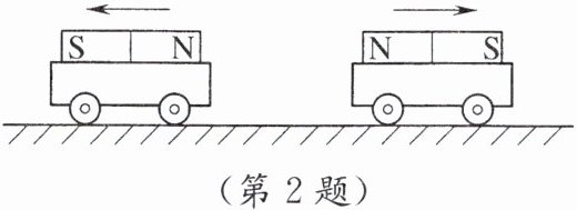 2. 如图所示,将载有条形磁体的两辆小车由静止同时释放,两小车迅速分离。此
