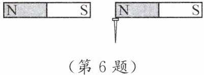 6. 小明用水平放置的一根条形磁体的N极吸起一根较小的铁钉,如图所示。若他用另一根同样的条形磁体的S极靠近原来磁体的N极,直至两条形磁体吸在一起,将会看到(