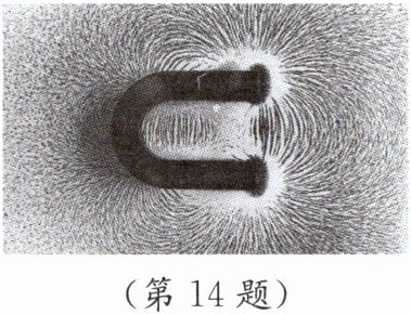 14. 在探究蹄形磁体周围磁场的实验中,在玻璃板上均匀地撒一层铁屑,然后将玻璃板平放在蹄形磁体上,轻敲玻璃板,铁屑就会有序地排列起来,如图所示。下列是对该实验中有关现象的分析,其中不正确的是(