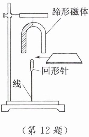 12. 如图所示,蹄形磁体向上吸起一枚回形针。将下列物体依次置于蹄形磁体与回形针之间,其中能使回形针落下的是(