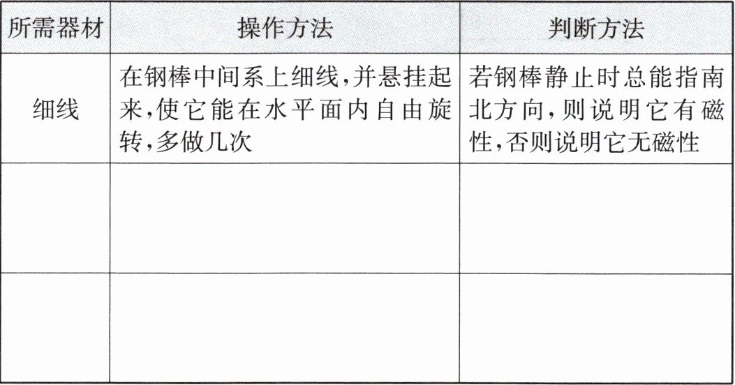 判断方法:若钢棒两端能与磁体一极产生排斥力,中间几乎无作用力,则该钢棒有磁性;若钢棒各部位均只表现为吸引力,则该钢棒无磁性