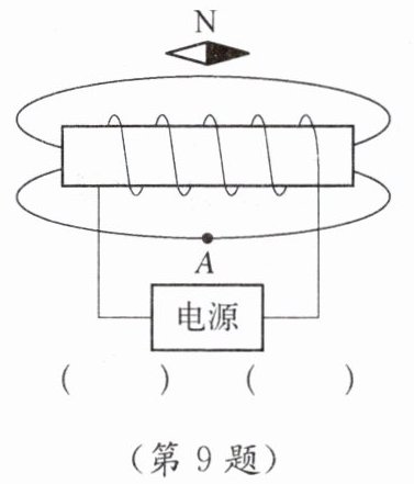 9. 如图所示,请根据小磁针静止时N极的指向标出$A$处的磁感线方向和电源的“+”“-”极。