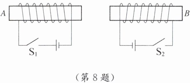 8. 如图所示,闭合开关$S_1$、$S_2$,两个通电螺线管的相互作用情况以及$A$、$B$端的极性分别是(