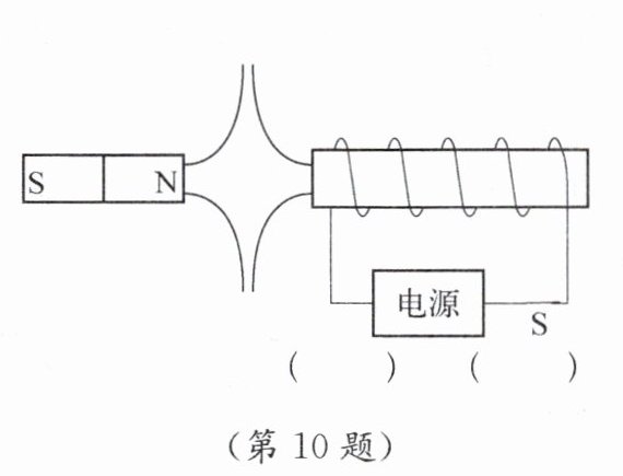 10. 如图所示,闭合开关S后,通电螺线管与条形磁体间的磁感线分布情况如图所示,请在图中标出磁感线的方向、螺线管的N极,并标出电源的“+”极和“-”极。