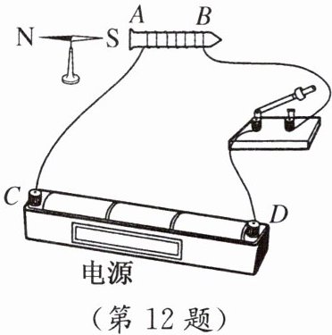 12. 如图所示,将导线绕在铁钉上做成的电磁铁接入电路。闭合开关后,小磁针的S极指向铁钉的A端。由此判断:电磁铁的A端是