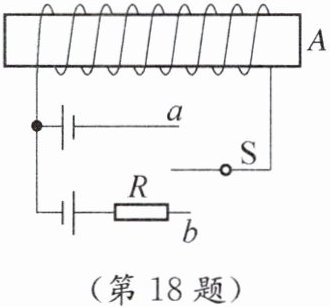 18. 如图所示,开关由触点$a$改接到触点$b$时,电磁铁的磁性强弱及$A$端的极性变化情况是(电源电压相同)(