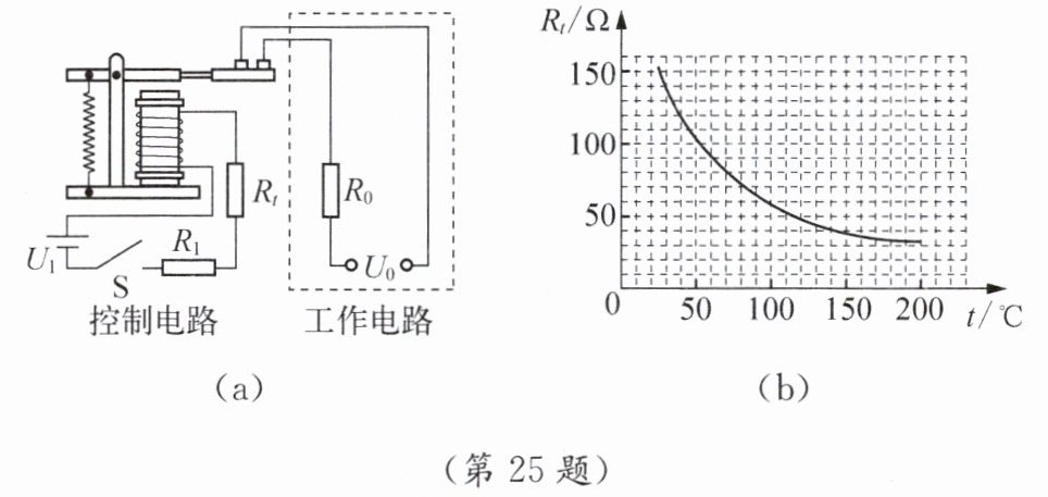 25. 如图(a)所示为电加热恒温箱工作原理的简化电路图。工作电路由电压$U_0=220 V$的电源和阻值为$R_0=88\ \Omega$的电热丝组成,控制电路是由电压$U_1=7.5 V$的电源、开关、电磁继电器(线圈电阻不计)、阻值为$R_1=60\ \Omega$的定值电阻和热敏电阻$R_t$组成的,热敏电阻$R_t$的阻值随温度变化的关系如图(b)所示。当恒温箱中的温度达到设定温度(即控制电路的电流达到$50\ mA$)时,切断工作电路从而停止加热。