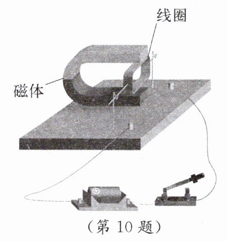 10. 先用金属回形针做两个支架,分别与电池的两极连接;再用漆包线绕一个矩形线圈,线圈的两侧各留一段漆包线作为转轴;然后用小刀将一侧转轴上的漆皮全部刮去,将另一侧转轴上的漆皮只刮去半周;最后,把线圈放在支架上,并将蹄形磁体按图示的位置放置。闭合开关,轻推线圈,它就会持续转动起来。
