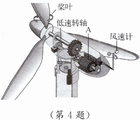 4. 在全球可持续发展的迫切需求下,能源成为制约各国社会发展的瓶颈。风力发电因具有清洁、可再生、技术成熟的优点,成为新能源建设的热门。如图所示是风力发电的核心部分——风机的内部结构示意图。其中,装置 A 中有磁体和可转动的线圈,风驱动风机的桨叶通过传动装置带动装置 A 转动,从而产生电能。装置 A 的工作原理是(